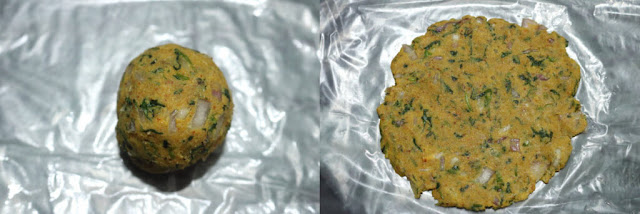 Gently transfer the Thalipeeth to your palm and then to the pan.
